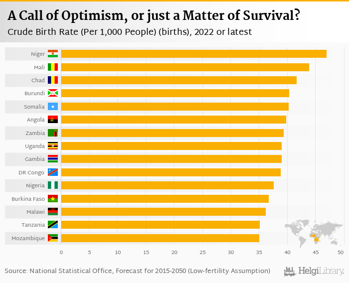 Based on a comparison of 177 countries in 2022, Niger ranked the highest in crude birth rate per 1,000 people with 47.0 births followed by Mali and Chad. On the other end of the scale was Portugal with 5.99 births, Japan with 6.16 births and Hong Kong with 6.41 births.