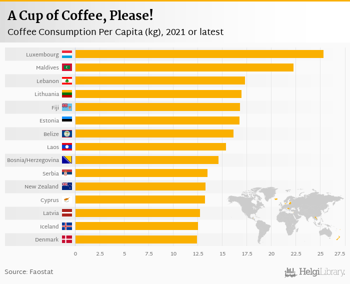 Based on a comparison of 165 countries in 2021, Luxembourg ranked the highest in coffee consumption per capita with 25.3 kg followed by Maldives and Lebanon. On the other end of the scale was India with < 0.001 kg, Afghanistan with 0.010 kg and Tanzania with 0.010 kg.