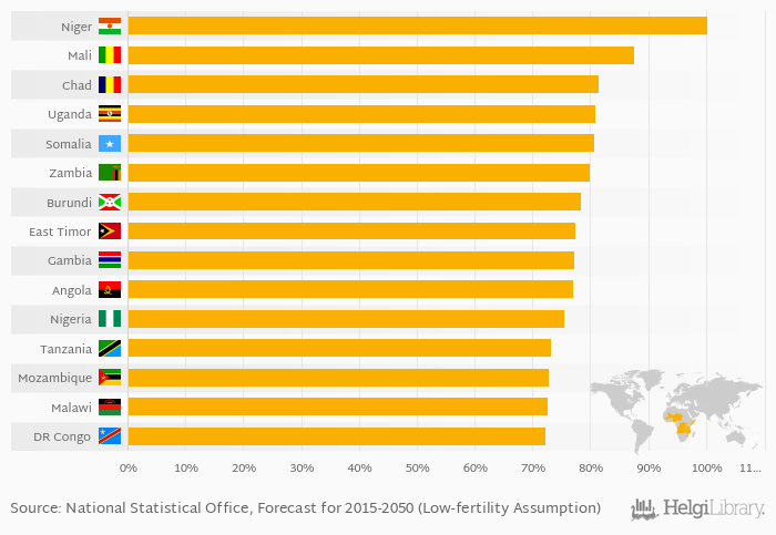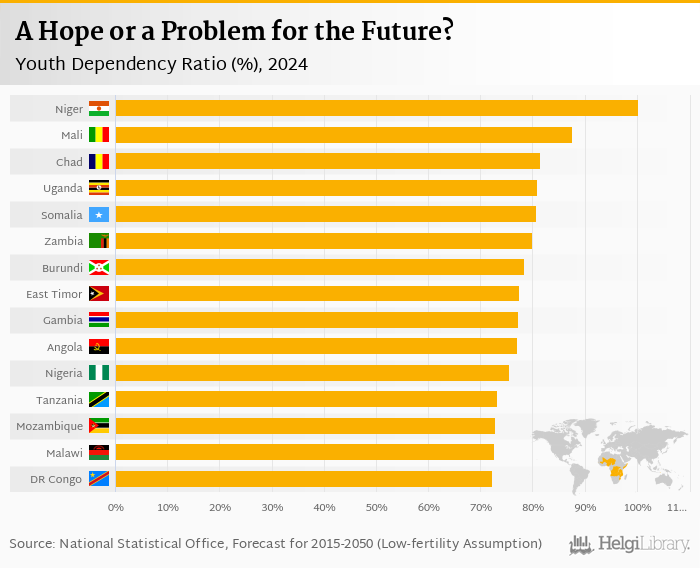 Based on a comparison of 174 countries in 2024, Niger ranked the highest in youth dependency ratio with 100% followed by Mali and Chad. On the other end of the scale was Qatar with 12.1%, Portugal with 14.5% and Hong Kong with 14.5%.