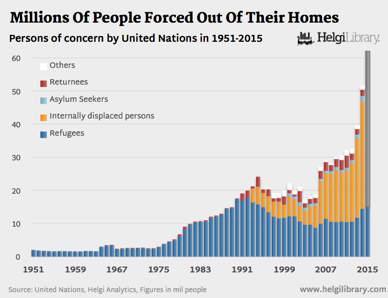 The year 2015 saw a record number of people fleeing their homes, with more than 60 million people uprooted by wars, conflict and persecution in countries ranging from Syria to South Sudan and Afghanistan, according to the United Nations.