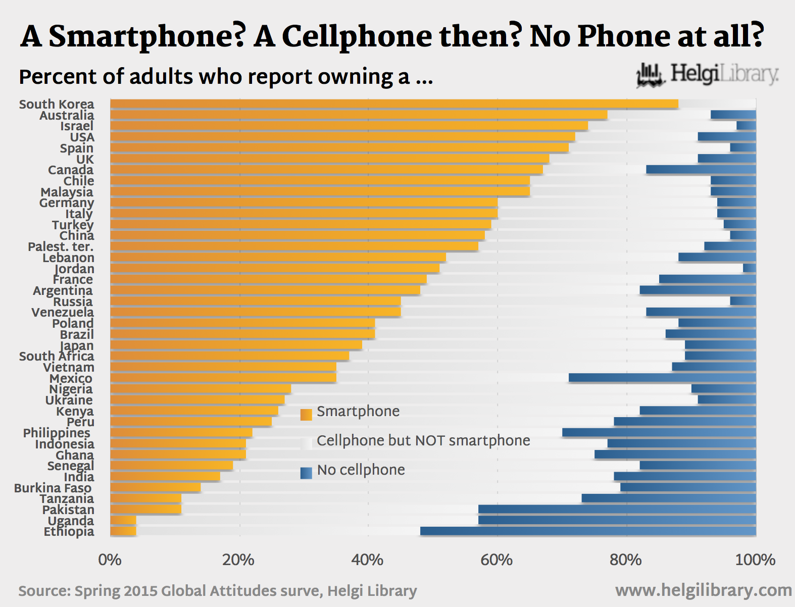 But smartphone ownership rates in emerging and developing nations are rising at an extraordinary rate, climbing from a median of 21% in 2013 to 37% in 2015. That’s nearly a doubling of the smartphone penetration rate during that two-year period.