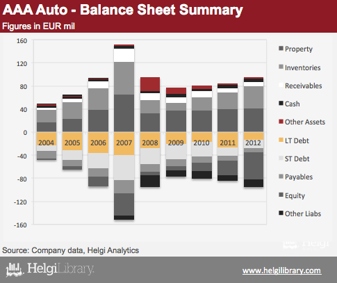 In 2012, AAA Auto sold over 50,000 cars through more than 30 car centres in the Czech Republic, Slovakia and Russia. The company owns all cars it sells (appr. 8,300 in stock) and it takes the Company roughly 1.5 months to sell its car on average when offered. The decline is Company's assets is related to the fact AAA Auto decided to leave Hungarian, Romanian and Polish markets following the financial crisis.