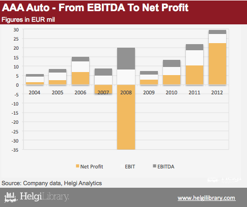 Following a hefty loss in 2008 of EUR 35 mil, the Company has been showing an impresive recovery since 2009. In 2012, AAA Auto reached EBITDA of EUR 29.6 mil, the record level since listing on the Prague Stock Exchange. The pitty is, the Company is not traded any more...