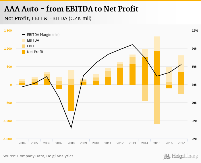 AAA Auto made a net profit of CZK 430 mil with revenues of CZK 10,489 mil in 2017, up by 449% and up by 13%, respectively, compared to the previous year. This translates into a net margin of 4.10%.