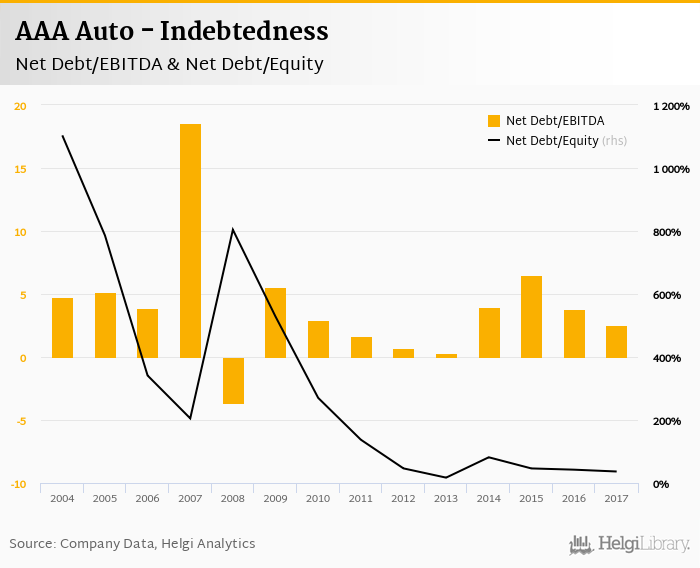 AAA Auto's net debt stood at CZK 1,668 mil and accounted for 36.5% of equity at the end of 2017. The ratio is down 5.80 pp compared to the previous year.