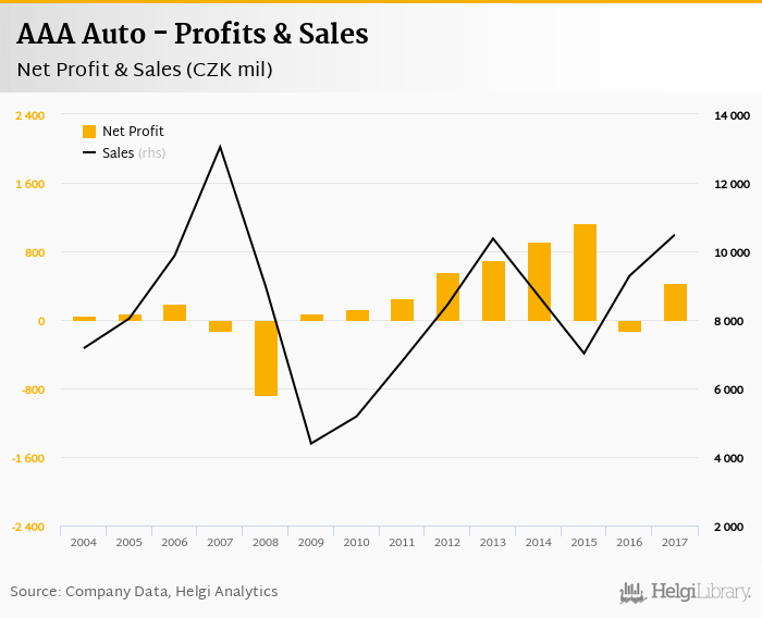 AAA Auto made a net profit of CZK 430 mil in 2017, up 449% compared to the previous year. Total sales reached CZK 10,489 mil, which is up 13% when compared to the previous year.