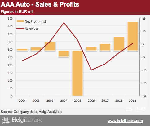Following a hefty loss in 2008 of EUR 35 mil, the Company has been showing an impresive recovery since 2009. In 2012, AAA Auto reached a net profit of EUR 22.3 mil, the record level since listing on the Prague Stock Exchange. The pitty is, the Company is not traded any more...