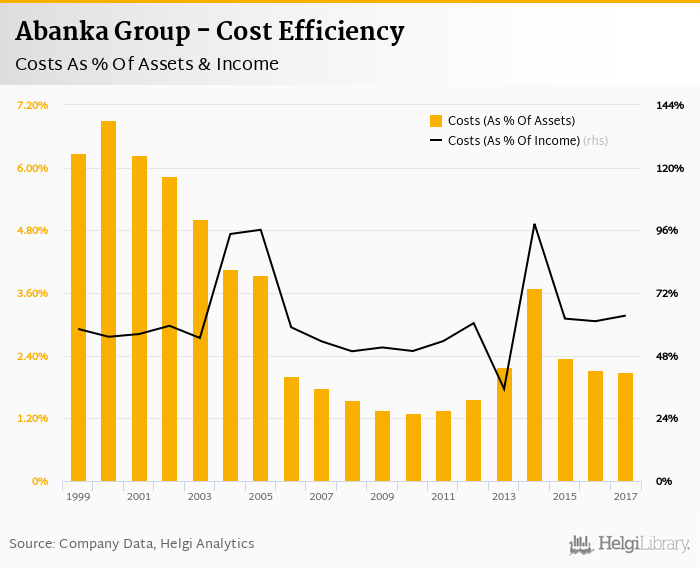 Comparing Abanka Group with its closest peers, NKBM Group operated in 2017 with a cost to income ratio of 83.3% in 2017, and SKB Banka reached 52.6%.