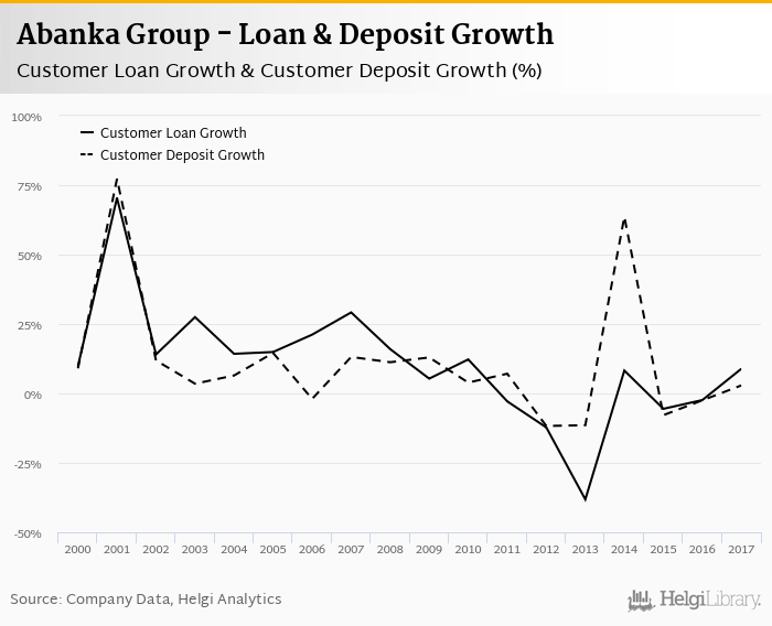 Abanka Group's customer loan growth reached 8.91% in 2017, up from -2.37% compared to the previous year. Historically, the bank’s loans growth reached an all time high of 70.4% in 2001 and an all time low of -38.1% in 2013. In the last decade, the average annual loan growth amounted to -2.38%.