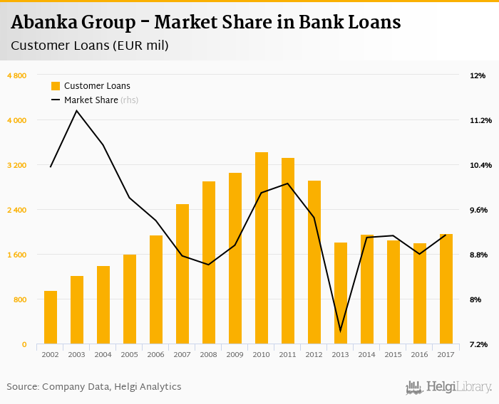 Abanka Group accounted for 9.14% of all customer loans issued in Slovenia at the end of 2017. Historically, the bank’s market share in customer loans reached an all time high of 11.4% in 2003 and an all time low of 7.44% in 2013.