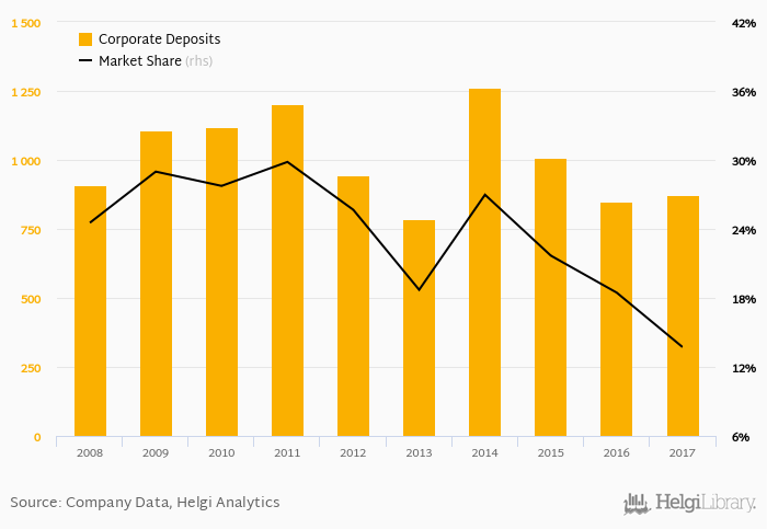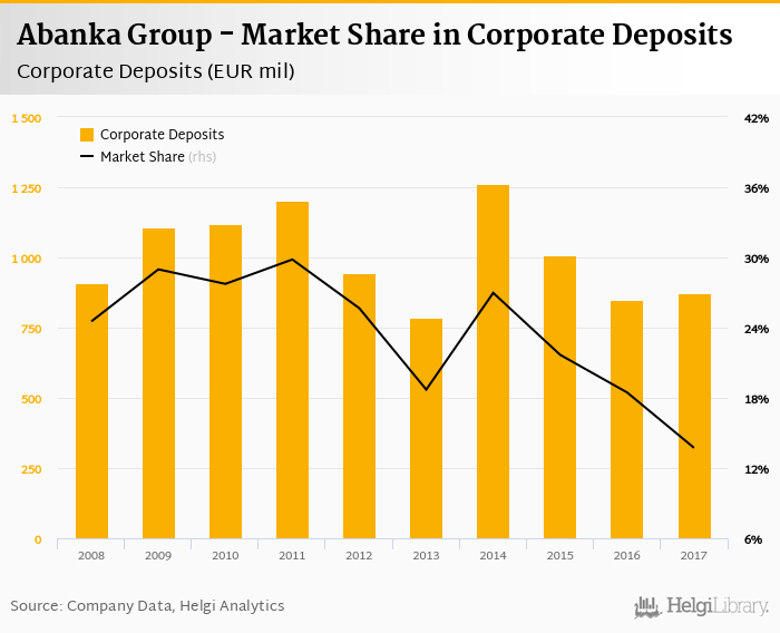 Abanka Group accounted for 13.7% of all corporate deposits taken by banks in Slovenia at the end of 2017. Historically, the bank’s market share in corporate deposits reached an all time high of 29.8% in 2011 and an all time low of 13.7% in 2017.