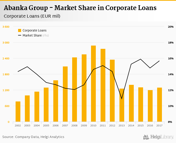 Abanka Group accounted for 15.7% of all corporate loans issued in Slovenia at the end of 2017. Historically, the bank’s market share in corporate loans reached an all time high of 15.9% in 2015 and an all time low of 10.9% in 2013.