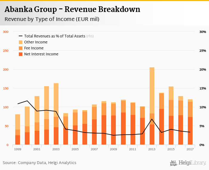 Comparing Abanka Group with its closest peers, Nova Ljubljanska banka generated total revenues of 3.99% of assets in 2017, NKBM Group operated with 2.90% revenue margin and SKB Banka produced total income worth 3.49% of assets.