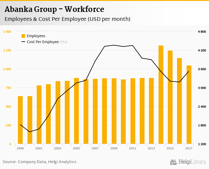 Abanka Group employed 1,047 persons in 2017, down 8.72% when compared to the previous year. Historically, the bank's workforce hit an all time high of 1,312 persons in 2014 and an all time low of 639 in 1999.