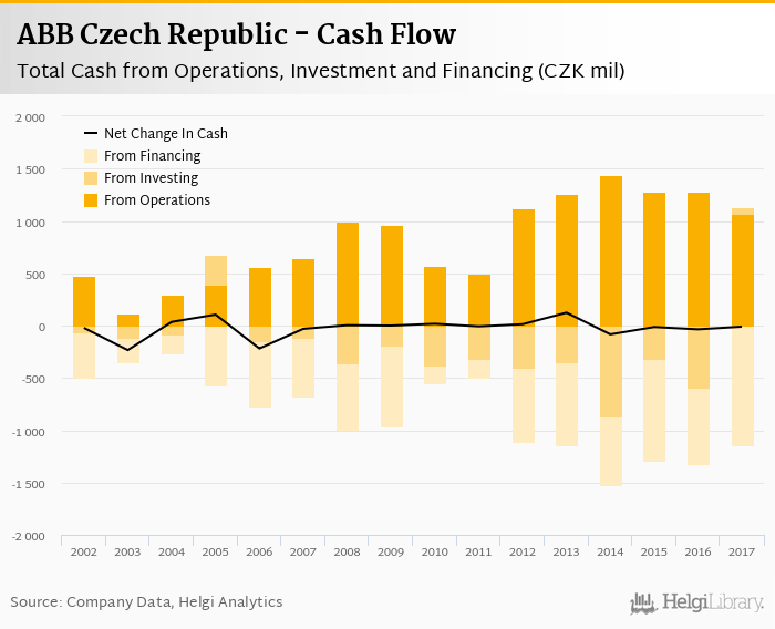 ABB Czech Republic's operating cash flow stood at CZK 1,068 mil in 2017, down 16.9% when compared to the previous year. Historically, between 2002 - 2017, the firm’s operating cash flow reached a high of CZK 1,438 mil in 2014 and a low of CZK 119 mil in 2003.