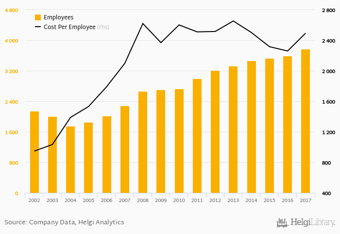 Staff cost represented of sales in 2017, 0 pp higher than a decade ago.