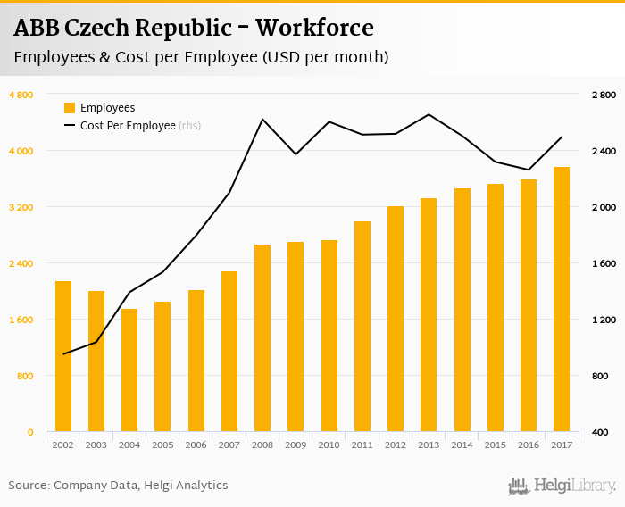 ABB Czech Republic employed 3,777 employees in 2017, up 5.06% compared to the previous year. Historically, between 2002 and 2017, the firm's workforce hit a high of 3,777 employees in 2017 and a low of 1,752 employees in 2004.