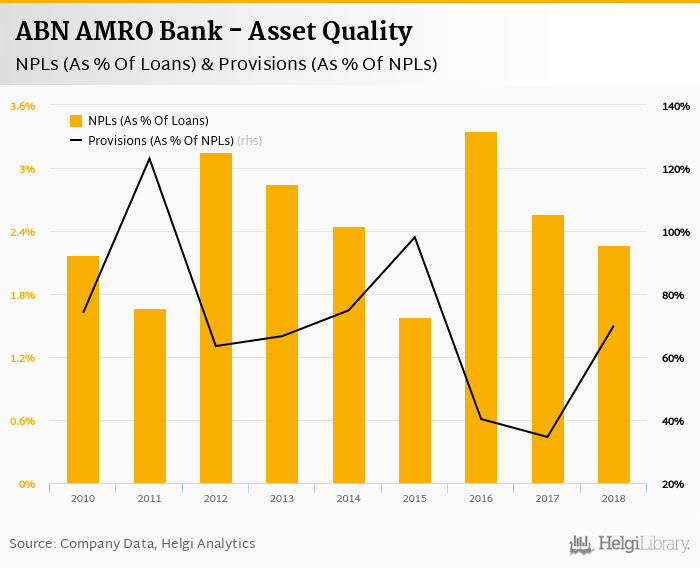 ABN AMRO Bank's non-performing loans reached 2.26% of total loans at the end of 2018, down from 2.56% compared to the previous year. Historically, the NPL ratio hit an all time high of 3.35% in 2016 and an all time low of 1.58% in 2015.