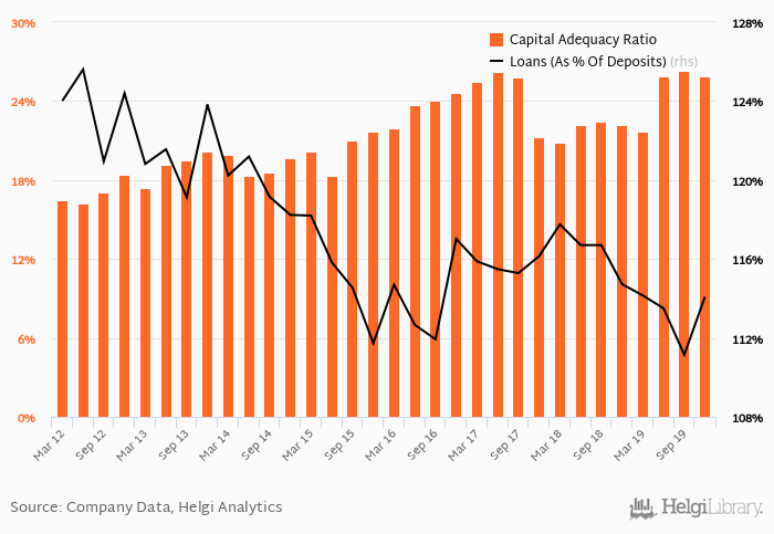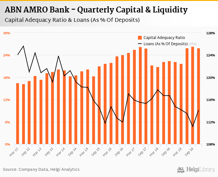 ABN AMRO Bank's capital adequacy ratio reached 25.9% at the end of fourth quarter of 2019, down from 26.3% when compared to the previous quarter. Historically, the bank’s capital ratio hit an all time high of 26.3% in 3Q2019 and an all time low of 16.2% in 2Q2012.