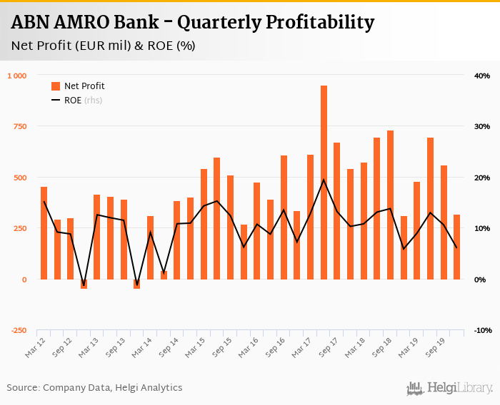 ABN AMRO Bank made a net profit of EUR 316 mil in the fourth quarter of 2019, up 1.94% when compared to the same period of last year. This implies a return on equity of 5.95%.