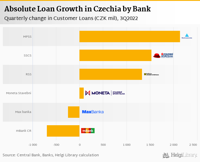 The comparison of 6 Czech banks shows Modra Pyramida Stavebni Sporitelna has grown the fastest in relative terms within the last quarter (2.59%% qoq), followed by Stavebni Sporitelna Ceske Sporitelny and Raiffeisen Stavebni Sporitelna. In absolute terms, however, Modra Pyramida Stavebni Sporitelna grabbed the largest piece of the pie when compared to the previous quarter (CZK 2,143 mil or 2.02% of the market net increase) followed by Stavebni Sporitelna Ceske Sporitelny and Raiffeisen Stavebni Sporitelna.