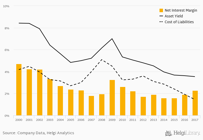 Historically, the bank’s net interest margin reached an all time high of 4.70% in 2000 and an all time low of 1.58% in 2014. The average margin in the last five years amounted to 1.86%.