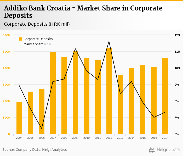 Addiko Bank Croatia accounted for 7.31% of all corporate deposits taken by banks in Croatia at the end of 2017. Historically, the bank’s market share in corporate deposits reached an all time high of 11.6% in 2012 and an all time low of 6.32% in 2006.