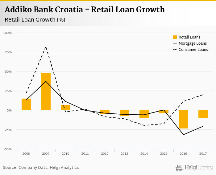Addiko Bank Croatia's retail loans reached HRK 6,465 mil at the end of 2017, down 9.44% compared to the previous year. In the last decade, the average annual loan growth amounted to 0%.
