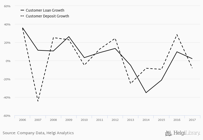 On the other hand, bank's customer deposit growth amounted to -8.31% at the end of 2017, down from 28.3% when compared to the previous year. Historically, the bank’s deposit growth reached an all time high of 35.5% in 2006 and an all time low of -44.5% in 2007. In the last decade, the average annual loan growth amounted to 4.07%.
