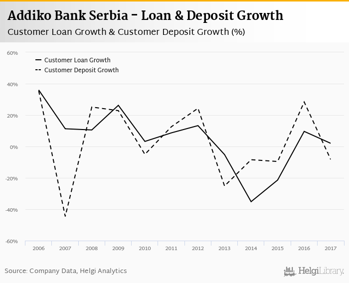 Addiko Bank Serbia's customer loan growth reached 2.00% in 2017, down from 9.62% compared to the previous year. Historically, the bank’s loans growth reached an all time high of 36.0% in 2006 and an all time low of -35.2% in 2014. In the last decade, the average annual loan growth amounted to -0.422%.