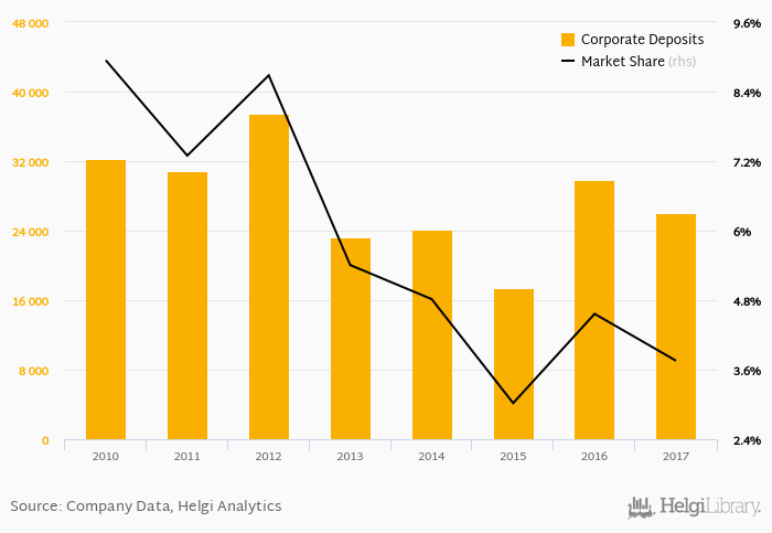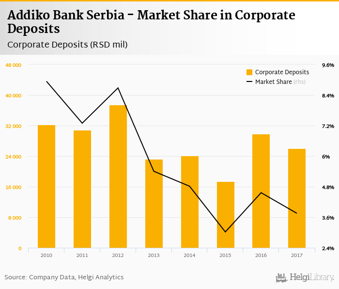 Addiko Bank Serbia accounted for 3.75% of all corporate deposits taken by banks in Serbia at the end of 2017. Historically, the bank’s market share in corporate deposits reached an all time high of 8.94% in 2010 and an all time low of 3.02% in 2015.