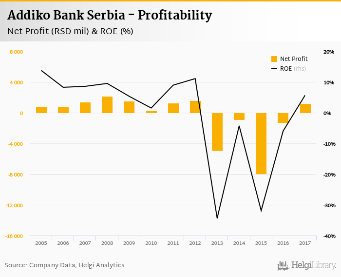 Comparing Addiko Bank Serbia with its closest peers, Komercijalna Banka Beograd generated a net profit of RSD 8,268 mil with ROE of 13.9% in 2017, Bank Intesa Serbia netted RSD 11,848 mil (ROE of 9.75%) and Raiffeisenbank Serbia announced a net profit of RSD 6,627 mil implying ROE of 11.7%.