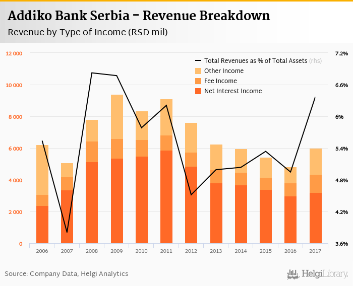 Comparing Addiko Bank Serbia with its closest peers, Komercijalna Banka Beograd generated total revenues of 5.43% of assets in 2017, Bank Intesa Serbia operated with 5.33% revenue margin and Raiffeisenbank Serbia produced total income worth 5.87% of assets.