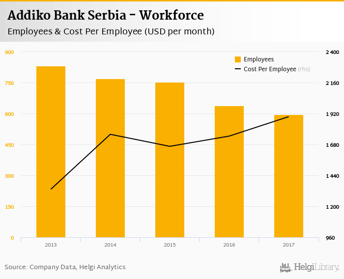 Addiko Bank Serbia employed 595 persons in 2017, down 6.89% when compared to the previous year. Historically, the bank's workforce hit an all time high of 831 persons in 2013 and an all time low of 595 in 2017.