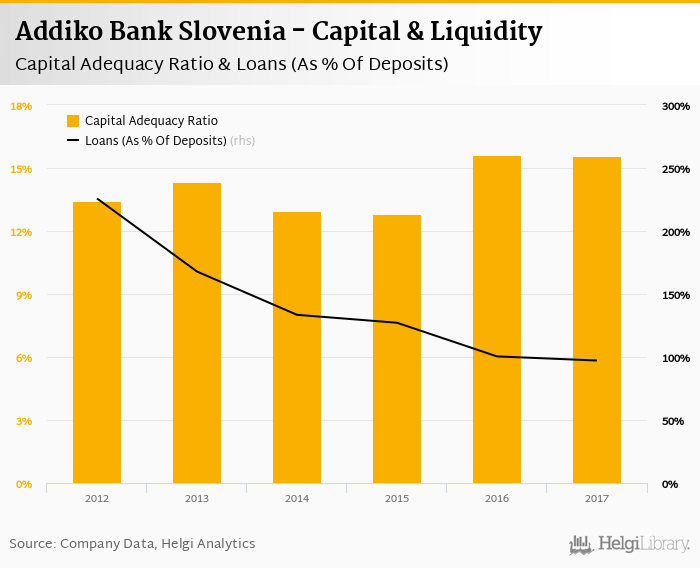 Comparing Addiko Bank Slovenia with its closest peers, Nova Ljubljanska banka ended the year 2017 with a capital adequacy ratio at 15.9% and loans to deposits of 70.8%, NKBM Group with 20.2% and 65.0% respectively and SKB Banka some 13.3% in terms of capital adequacy and 97.5% of loans to deposits at the end of 2017.