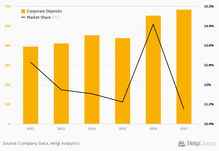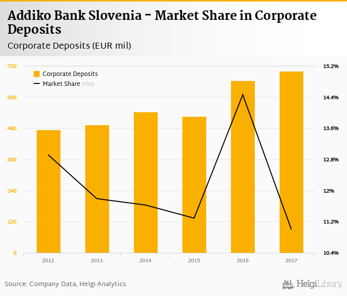 Addiko Bank Slovenia accounted for 11.0% of all corporate deposits taken by banks in Slovenia at the end of 2017. Historically, the bank’s market share in corporate deposits reached an all time high of 14.5% in 2016 and an all time low of 11.0% in 2017.