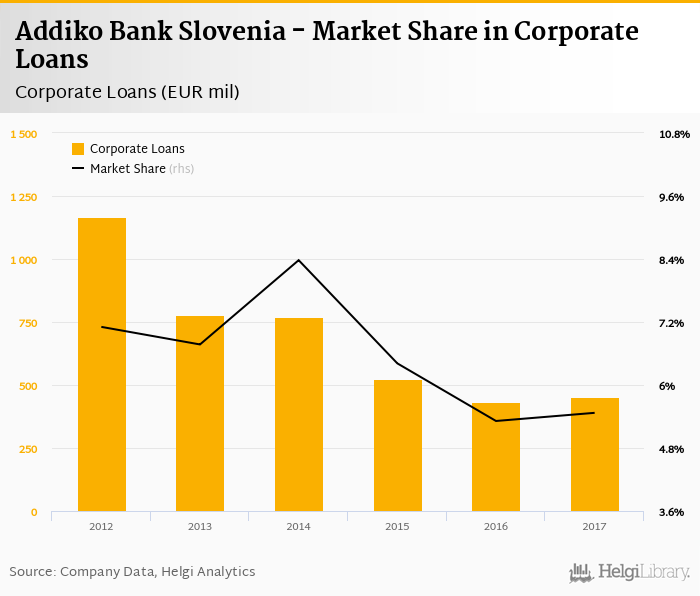 Addiko Bank Slovenia accounted for 5.47% of all corporate loans issued in Slovenia at the end of 2017. Historically, the bank’s market share in corporate loans reached an all time high of 8.38% in 2014 and an all time low of 5.31% in 2016.