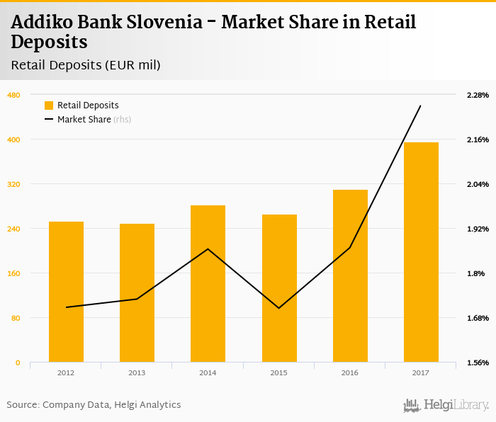 Addiko Bank Slovenia accounted for 2.25% of all retail deposits taken by banks in Slovenia at the end of 2017. Historically, the bank’s market share in retail deposits reached an all time high of 2.25% in 2017 and an all time low of 1.70% in 2015.