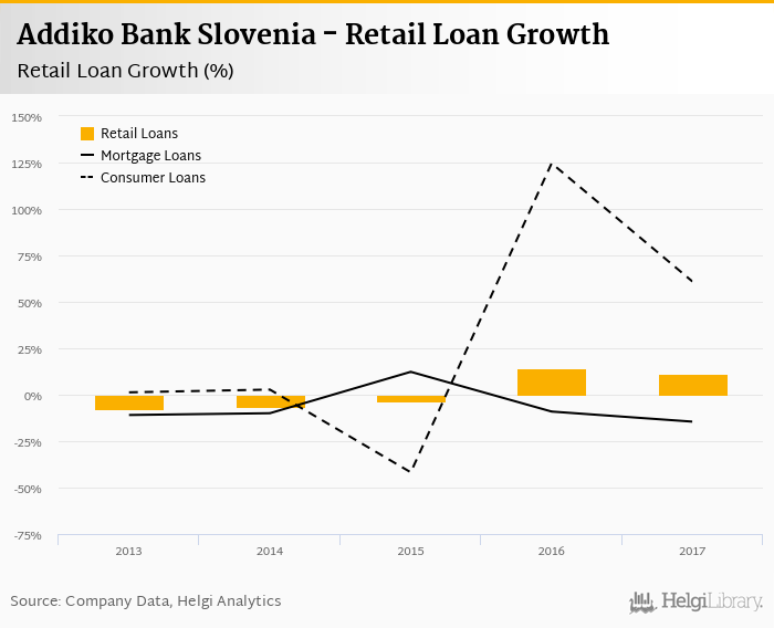 Addiko Bank Slovenia's retail loans reached EUR 611 mil at the end of 2017, up 11.3% compared to the previous year. In the last decade, the average annual loan growth amounted to 0%.