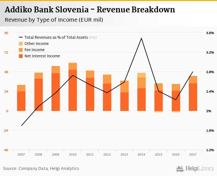 Comparing Addiko Bank Slovenia with its closest peers, Nova Ljubljanska banka generated total revenues of 3.99% of assets in 2017, NKBM Group operated with 2.90% revenue margin and SKB Banka produced total income worth 3.49% of assets.