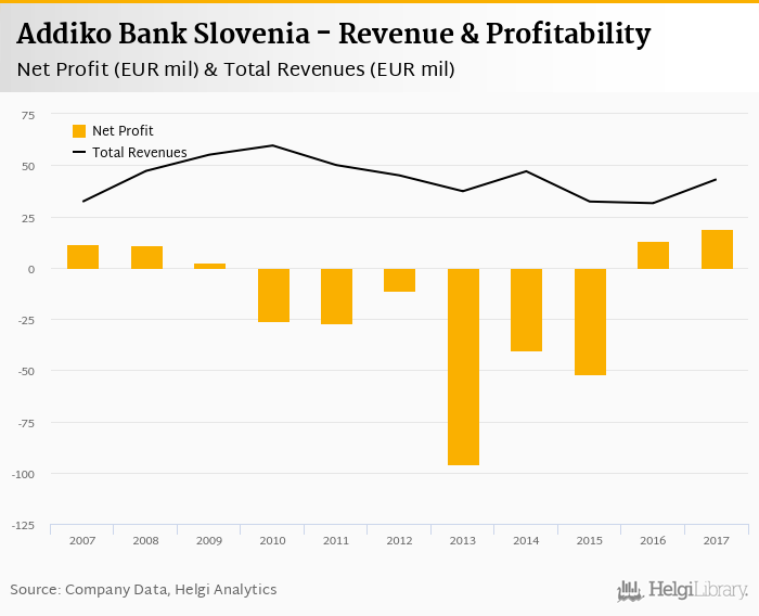 Comparing Addiko Bank Slovenia with its closest peers, Nova Ljubljanska banka generated a net profit of EUR 225 mil with revenues of EUR 489 mil in 2017, NKBM Group netted EUR 47.8 mil (revenues of EUR 143 mil) and SKB Banka announced a net profit of EUR 43.4 mil (revenues of EUR 111 mil).