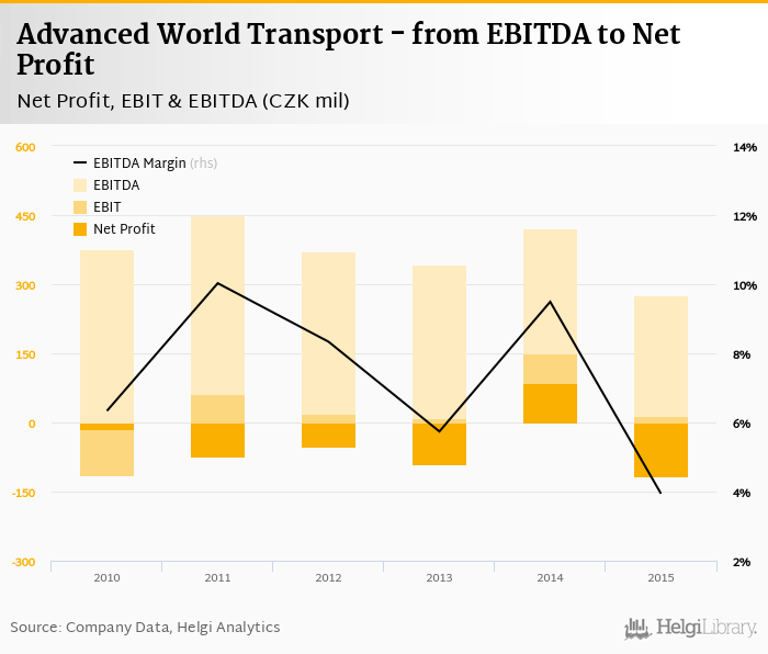 Advanced World Transport made a net profit of CZK -118 mil with revenues of CZK 4,013 mil in 2015, down by 238% and down by 9.56%, respectively, compared to the previous year. This translates into a net margin of -2.93%.