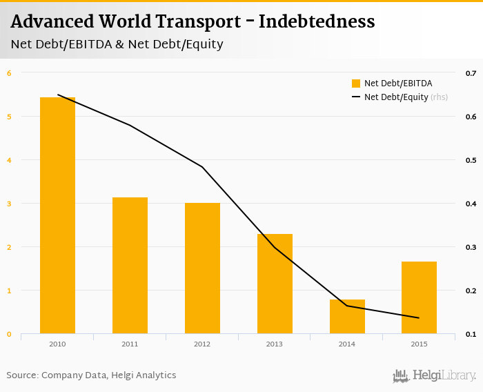 Advanced World Transport's net debt stood at CZK 263 mil and accounted for 0.135 of equity at the end of 2015. The ratio is down 0.028 pp compared to the previous year.