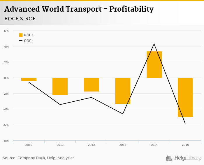 As far as Advanced World Transport's peers are concerned, CD Cargo generated ROE of 1.96% and ROCE of 1.27% in 2015. Bohemia Cargo's profitability reached 8.73% and 3.87%, respectively. CS Cargo operated with 1.48% and 0.158% returns in 2015.