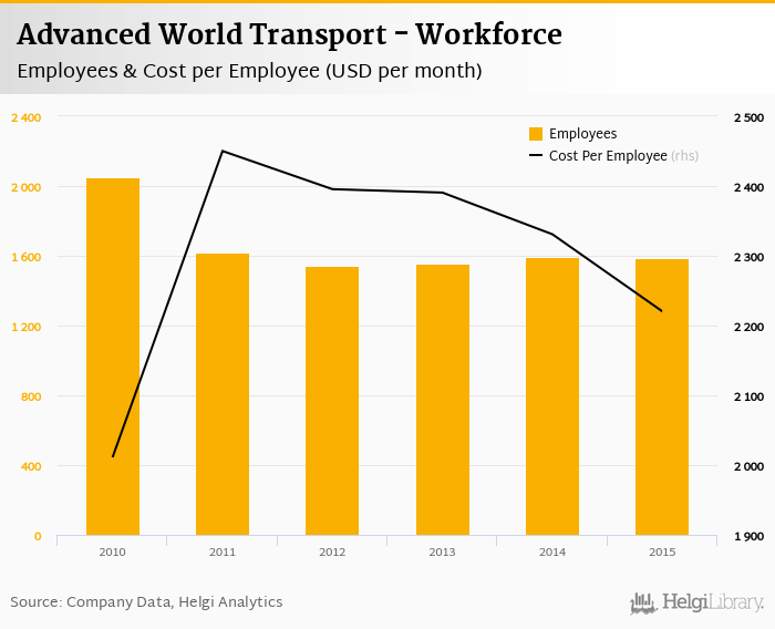 Advanced World Transport employed 1,589 employees in 2015, down 0.376% compared to the previous year. Historically, between 2010 and 2015, the firm's workforce hit a high of 2,050 employees in 2010 and a low of 1,542 employees in 2012.