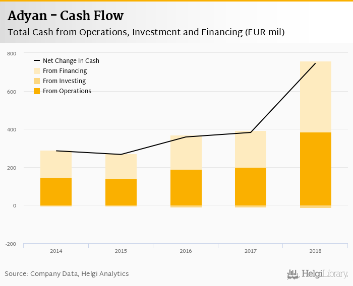 Adyan's operating cash flow stood at EUR 384 mil in 2018, up 91.4% when compared to the previous year. Historically, between 2014 - 2018, the firm’s operating cash flow reached a high of EUR 384 mil in 2018 and a low of EUR 138 mil in 2015.