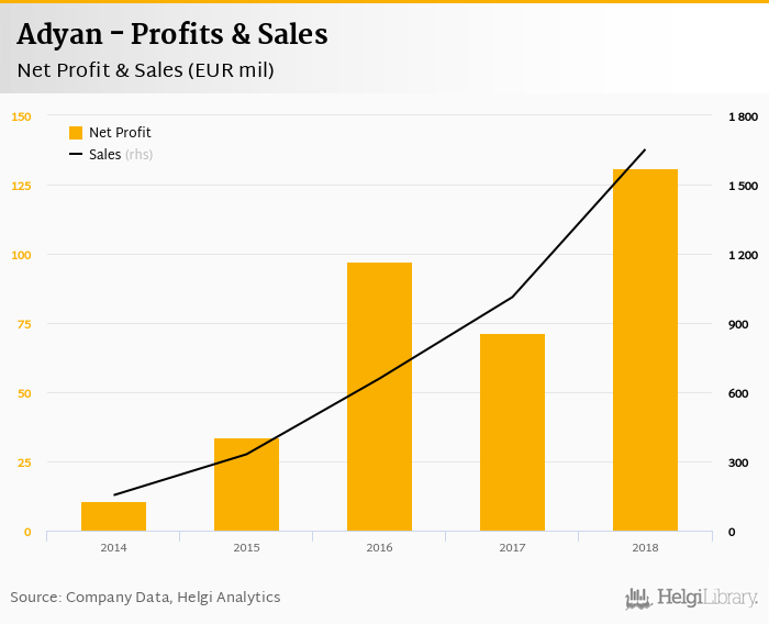 Adyan made a net profit of EUR 131 mil in 2018, up 83.9% compared to the previous year. Total sales reached EUR 1,653 mil, which is up 63.3% when compared to the previous year.