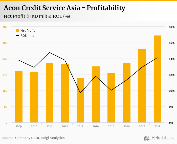 Aeon Credit Service Asia made a net profit of HKD 437 mil in 2018, up 17.8% compared to the previous year. This implies a return on equity of 14.1%.