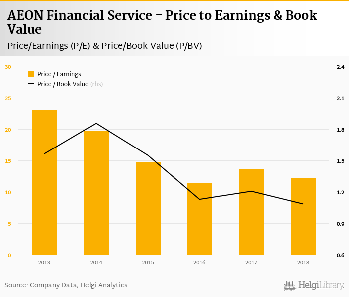 AEON Financial Service stock traded at JPY 2,137 per share at the end 2018 implying a market capitalization of USD 4,386 mil.
