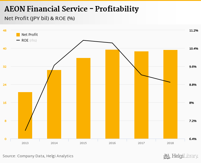 AEON Financial Service made a net profit of JPY 39.4 bil in 2018, up 1.89% compared to the previous year. This implies a return on equity of 8.89%.